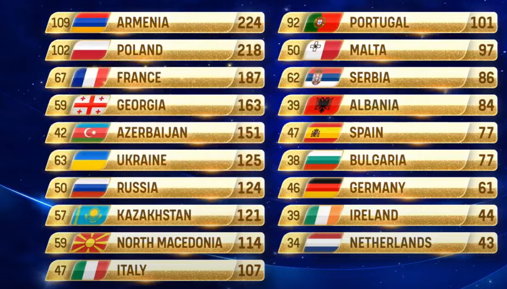 Polen ble nummer to, kun seks poeng bak Armenia. Vertslandet Frankrike rundt av kveldens topp tre. Vi gratulerer Malena med seieren!