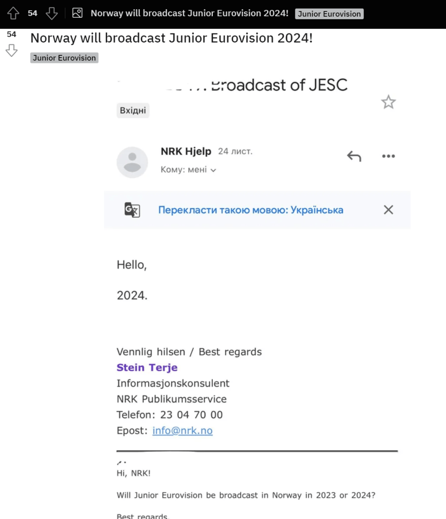 Ifølge dette innlegget på Reddit, skal NRK ha uttalt i en mail at de skal vise Junior Eurovision 2024. Som folk i kommentarfeltet poengterer, er ikke svaret så veldig utfyllende, og man kan alltids diskutere om en enkel e-post fra en NRK-ansatt kan anses som troverdig kilde. Foreløpig er dette bare et rykte funnet på Reddit, men likevel er det verdt å nevne at NRK for første gang siden 2005 viser noe tegn til interesse for å sende Junior Eurovision.