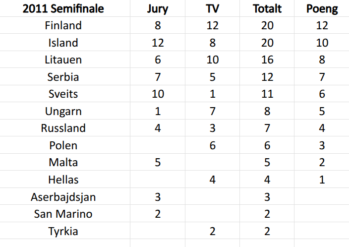 Hvis semifinalen i 2010 var vanskelig å tenke seg frem til, så var semifinalen i 2011 intet annet enn en runde skikkelig hodebry. For her var det en del steder jeg slet med å få ting til å gå opp, og et par ganger måtte sette sammen poengene på nytt. Jeg sitter nå med et endelig resultat, fortsatt litt usikker på hvor mye jeg tror på det selv, men ut fra de poengene Norge ga, så ble dette til slutt det mest sannsynlige estimatet.