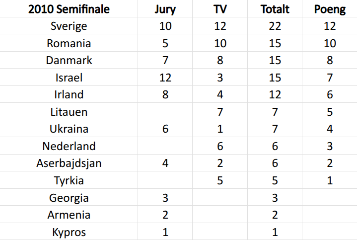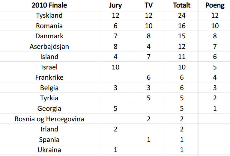 I denne artikkelen vil jeg fokusere på 2010 og 2011. I senere år ble det standard at hele rangeringen fra første til sisteplass ble slått sammen for å avgjøre poengene, men frem til 2012 var det kun topp 10 fra jury og TV-seere som ble slått sammen. Om det ble likt mellom to låter, var det den som gjorde det best hos folket som fikk den høyeste poengsummen.