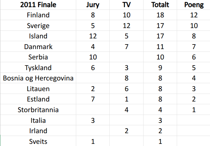 Og nok en gang, vill gjetting når det gjelder de resterende poengene. Italia vant juryene med god margin, ikke umulig at den norske juryen kan ha gitt litt. Irske Jedward var populære, og fikk høye poeng fra de nordiske nabolandene. Trolig at de kan ha vært innom topp 10 hos norske TV-seere også. Resultatene fra 2011 avrundes med et lite siste jurypoeng til Sveits, da de trolig fikk en høy sum fra juryen i semifinalen.